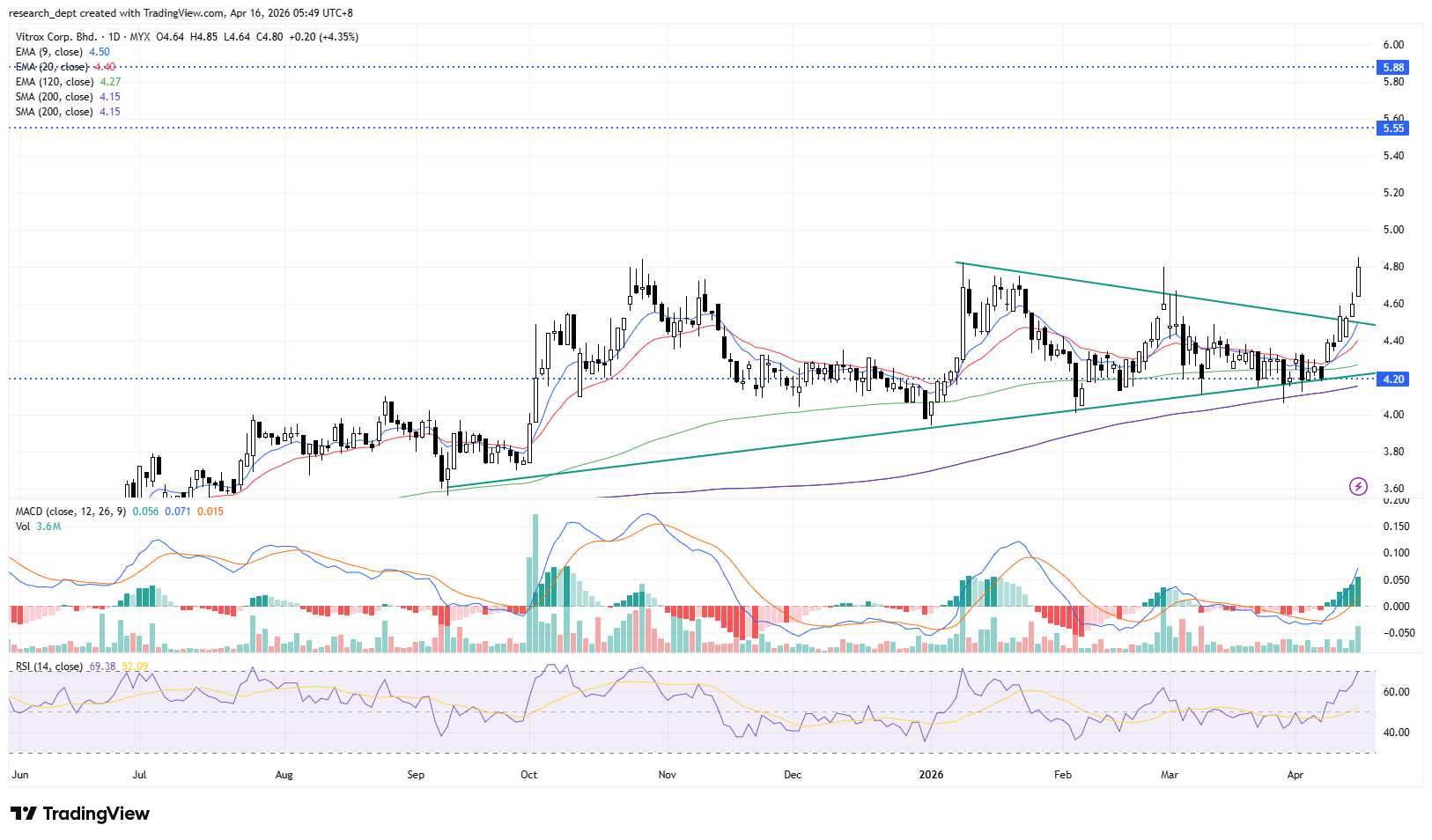 Given the above, price could potentially lead to a potential resistance at RM5.55, followed by RM5.88, while the stop-loss is set at RM4.20.