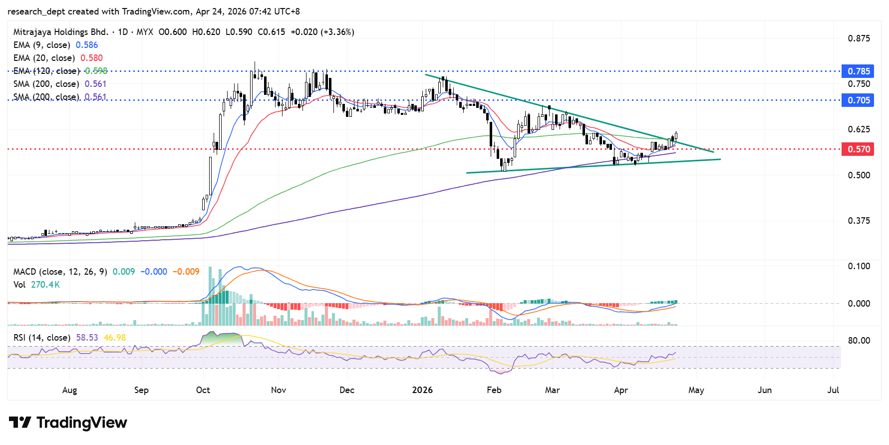 We expect prices to rise towards RM0.705, followed by RM0.785, while the stop-loss is set at RM0.57.