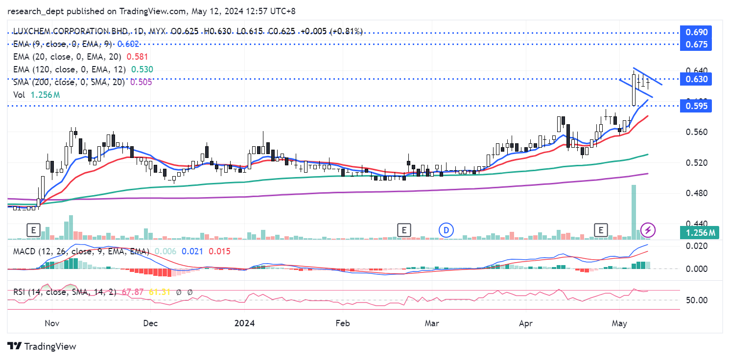 Price is o n the uptrend formation since mid-March 2024. After hitting the recent peak, price staged a mild consolidation over the past three sessions. Traders may anticipate for a potential flag-formation breakout above RM0.63 to target the next resistances located a t RM0.675-0.69. Downside wise, support is envisaged at RM0.595