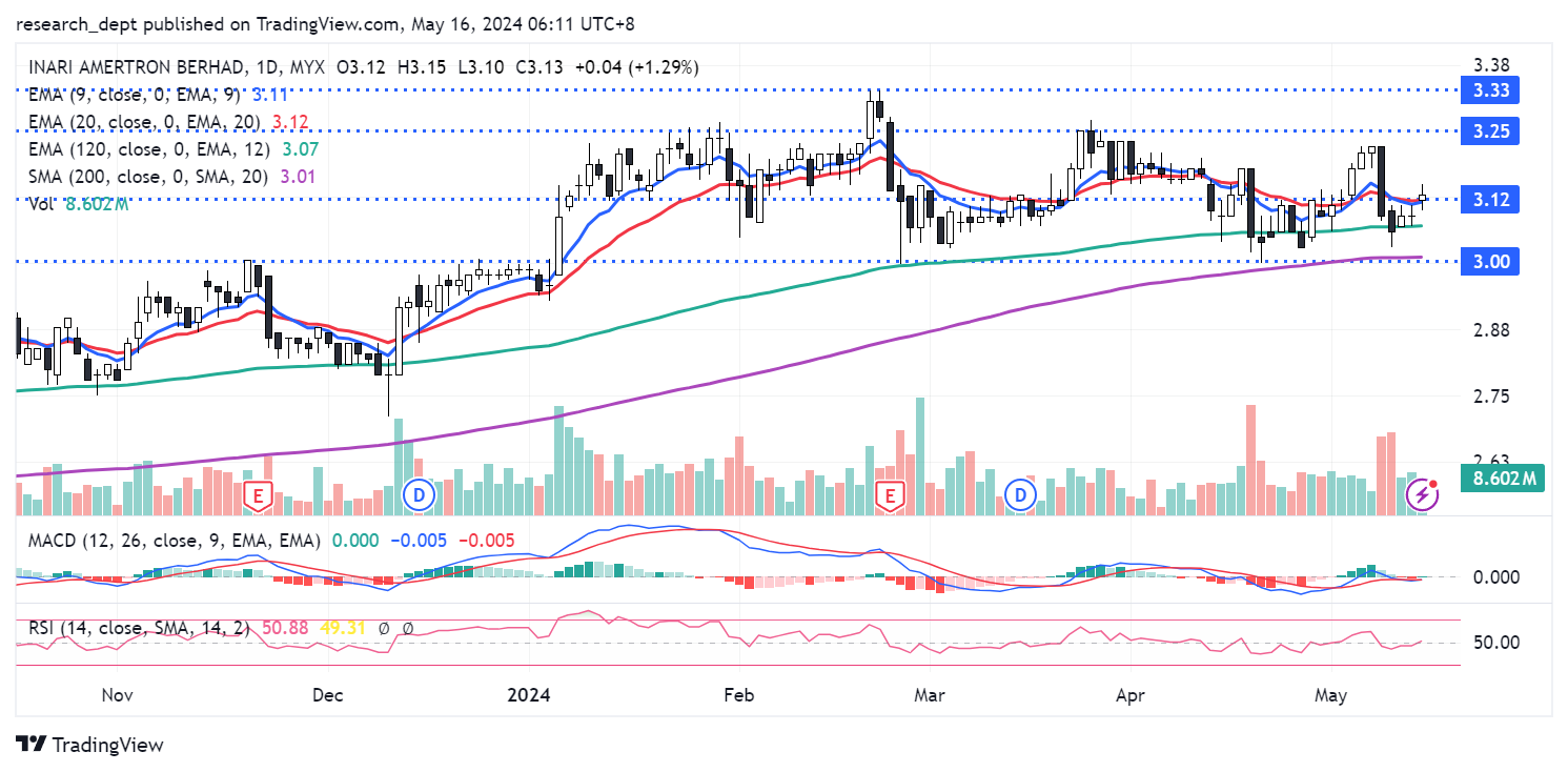 Price is on the consolidation pattern on the longer term perspective. After bouncing off EMA120 on several occasion, price has gradually recovered above EMA9. Following the short-term breakout above RM3.12, price may advance to target the next resistances located at RM3.25-3.33. Downside wise, support is envisaged at RM3.00.