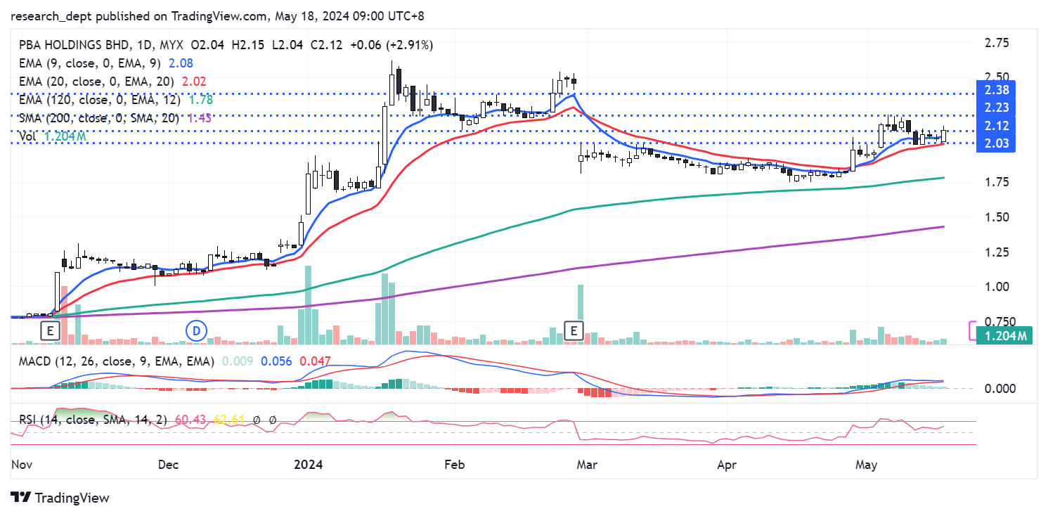 Price has found stability above EMA120 and staged multi-month long of consolidation. Price gradually recovered and the uptrend formation was re-established. For now, traders may monitor for a breakout above RM2.12. Next resistances are located at RM2.23-2.38. Downside wise, support is pegged at RM2.03.