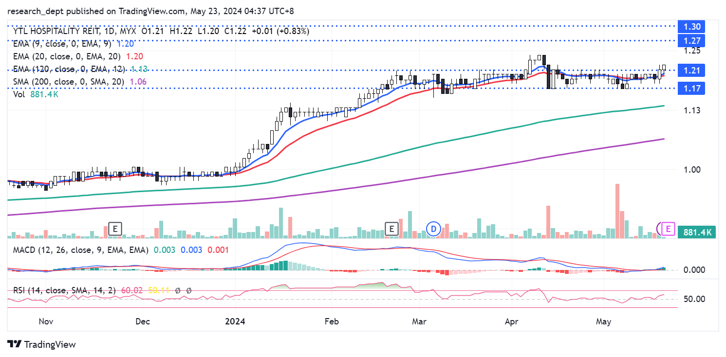 Price has turned into a consolidation pattern in recent months, supported above EMA120. Price has recently trended above EMA9 and subsequently formed a short-term consolidation breakout above RM1.21. Price may advance to target the next resistances located at RM1.27-1.30. Downside wise, support is pegged at RM1.17.