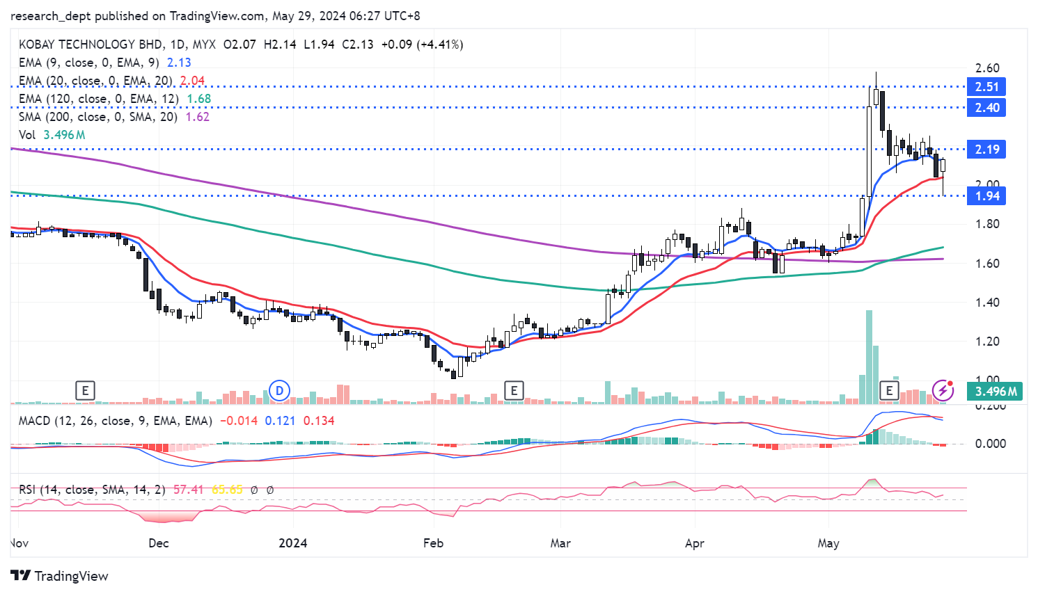 Price appears to have bottomed out in early 2024. Price gradually marched higher and the uptrend formation was established in recent weeks. Following the recent pullback, price formed a hammer candle to remain above EMA20. Traders may monitor for a potential recovery above RM2.19 to target the next resistances located at RM2.40-2.51. Downside wise, support is envisaged at RM1.94.