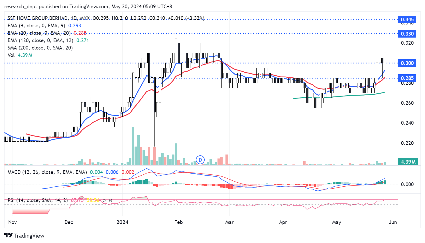 Price has hit the peak in early 2024 before staging a pullback. After bouncing off EMA120, price recovered gradually along with improved trading liquidity. With the recent short-term resistance breakout above RM0.30, price may advance to target the next resistances located at RM0.33-0.345. Downside wise, support is envisaged at RM0.285.