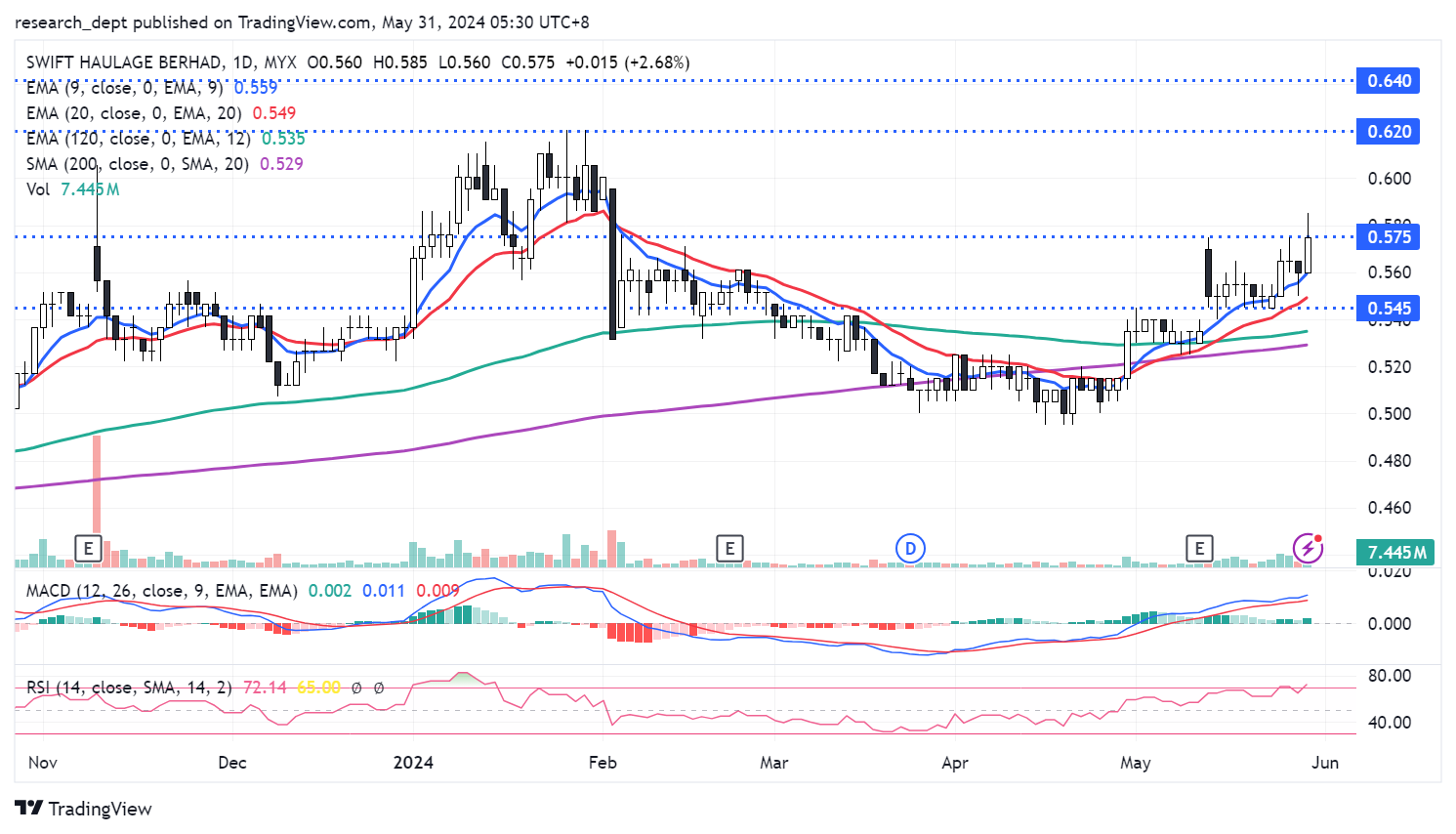 Price has staged a pullback and briefly slide below SMA200 in April 2024. Since then, price formed a recovery and the uptrend formation was re-established. Price remained above EMA9 over the past month and Traders may monitor for a potential breakout above RM0.575 to target the next resistances located at RM0.62-0.64. Downside wise, support is pegged at RM0.545.