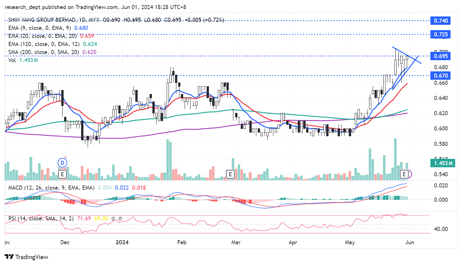 After establishing a base in April 2024, price staged a sharp recovery. Consequently, the uptrend formation was established. With price advancing and largely supported above EMA9 over the past month, traders may monitor for a potential short-term triangle formation breakout above RM0.695 to target the next resistances located at RM0.725-0.74. Downside wise, support is pegged at RM0.67.