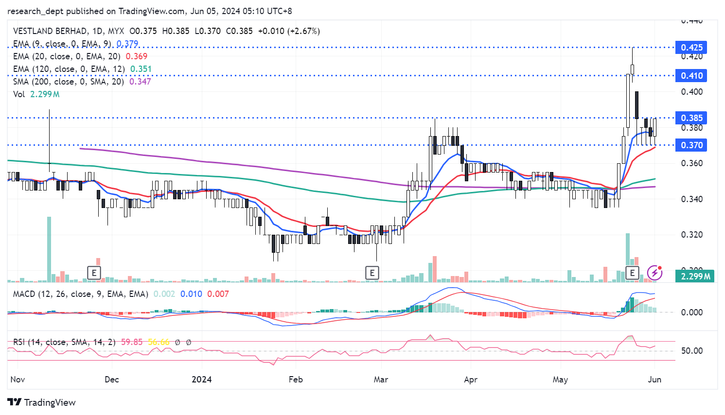 Price has formed a second wave of rally in mid-May 2024. Price subsequently staged a pullback towards EMA20 before establishing a short-term consolidation. Traders may monitor for a potential breakout above RM0.385 to target the next resistances located at RM0.41-0.425. Downside wise, support is pegged at RM0.37.