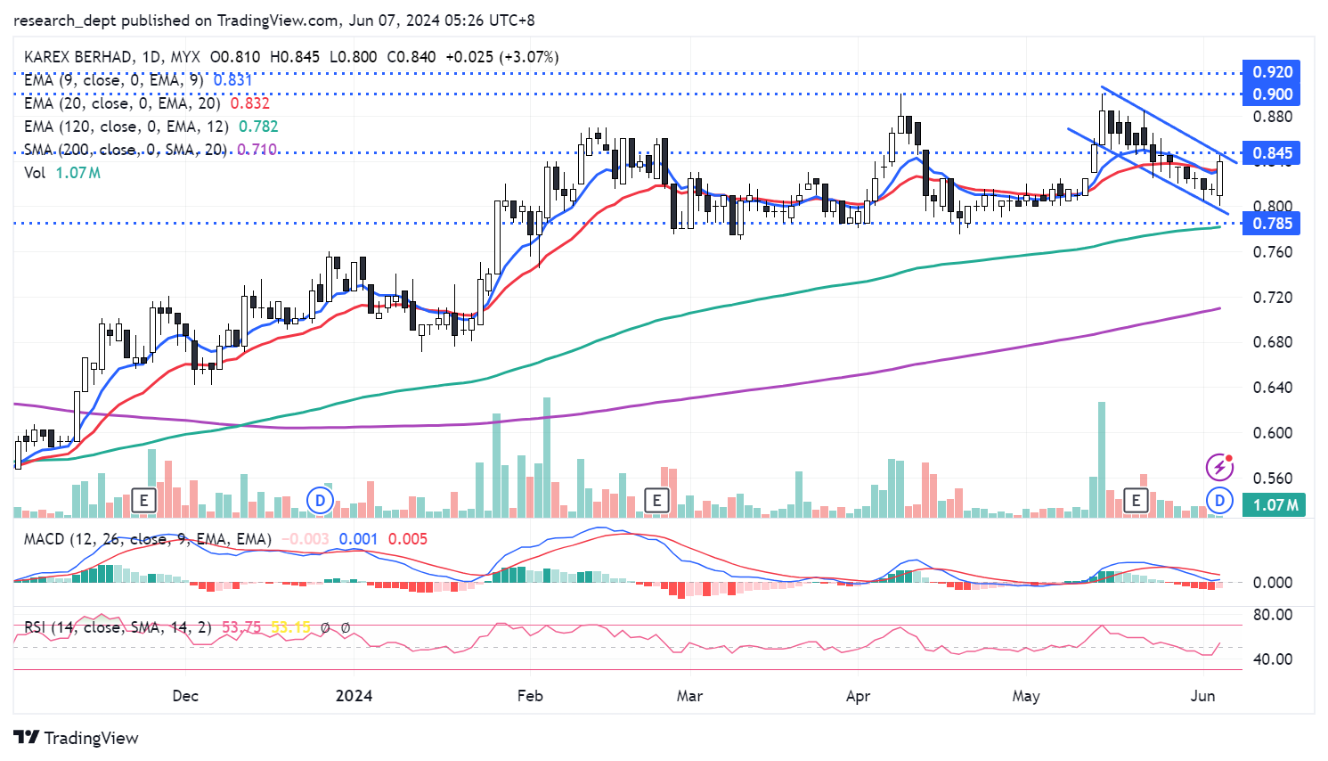 Price has turned into a consolidation pattern in recent months and has formed a double top formation. After multiple sessions of pullback, price formed a bullish candle and recovered above EMA9. Traders may monitor for a potential flag-formation breakout above RM0.845 to target the next resistances located at RM0.90-0.92. Downside wise, support is pegged at RM0.785.