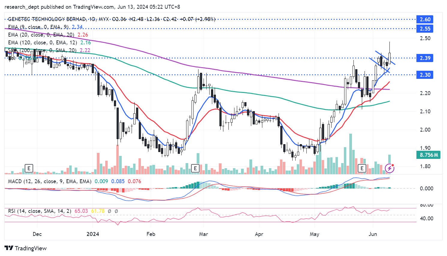 After forming double bottom formation earlier in 2024, price has advanced to close above SMA200 last month. Price has recently pullback towards EMA9 before forming a gap up formation and consequently formed a flag formation breakout above RM2.39. Price may advance to target the next resistances located at RM2.55-2.60. Downside wise, support is pegged at RM2.30.