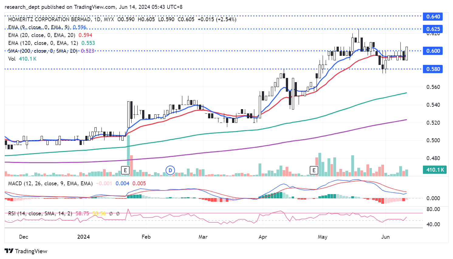 Price remain on the uptrend formation since the start of the year. The rally took a breather after price peaked last month before a short-term consolidation took place in recent weeks. With volumes building up, price formed a bullish candle to breakout above RM0.60 and may advance to target the next resistances located at RM0.625-0.64. Downside wise, support is pegged at RM0.58.