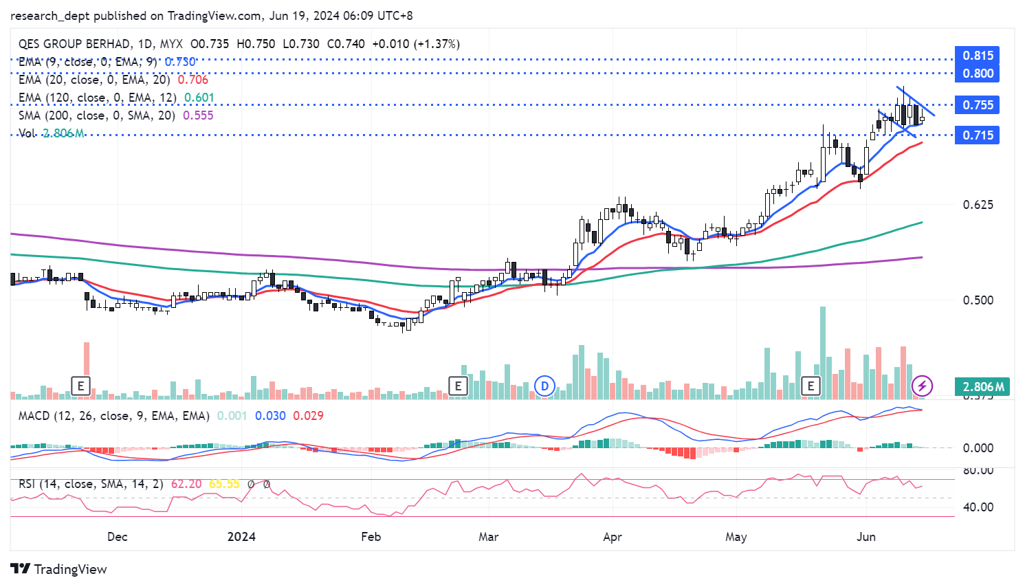 Price is on the uptrend formation and is largely supported above EMA20 in recent month. Coming closer, price has turned into a short-term consolidation pattern above EMA9. For now, traders may anticipate for a potential flag-formation breakout above RM0.755 to target the next resistances located at RM0.80-0.815. Downside wise, support envisaged at RM0.715.